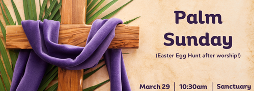Join us at 10:30am in the Sanctuary for a unique Palm Sunday worship experience. After worship, children and families are welcome to join us for an Easter Egg Hunt! Lunch will be provided in the Coffee Shop before the hunt. We'd be honored to have you as our guest.