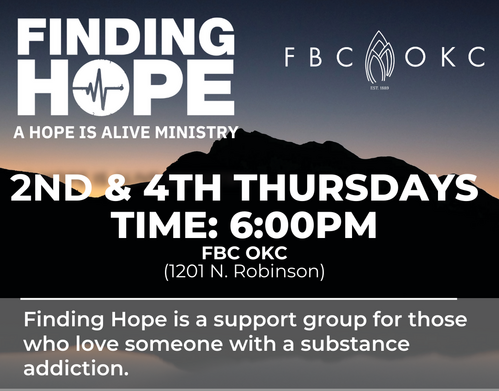 Finding Hope is a support group for loved ones of addicts and alcoholics. When you start listening to people’s stories, you discover that addiction is not an isolated issue with just a handful of families. It affects us all in some form or fashion. We are so excited to share that FBCOKC has started a "Finding Hope" group hosted in our church. Meetings take place every 2nd and 4th Thursday every month at 6:00pm in the Coffee Shop of FBCOKC. Please use the SOUTH entrance under the blue canopy and follow the signs to the Coffee Shop.